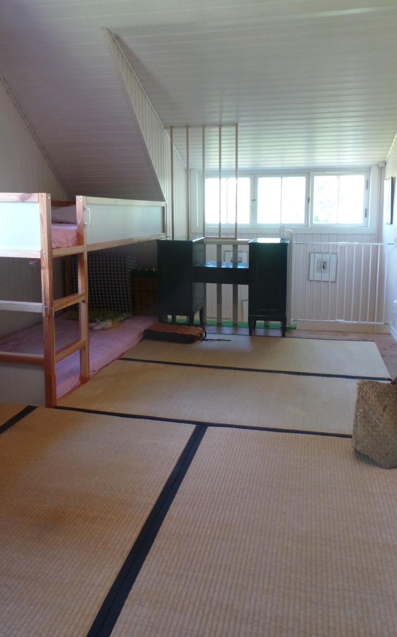 Yksi yläkerran sisustuksellinen pähkäilykohta meillä on ollut nuo Joelin omalle asunnolleen aikoinaan hankkimat ihanat-ihanat tatamit. Niitä on yläkerrassa ollut käytössä kolme (kuudesta), mutta ne eivät ole ikinä oikein asettuneet kohdilleen. Ja syykin on ollut ihan selvä: kylpyhuoneen ovi. Se ei nimittäin mahdu aukeamaan, jos tatamit on oikeaoppisesti (?) aseteltu.